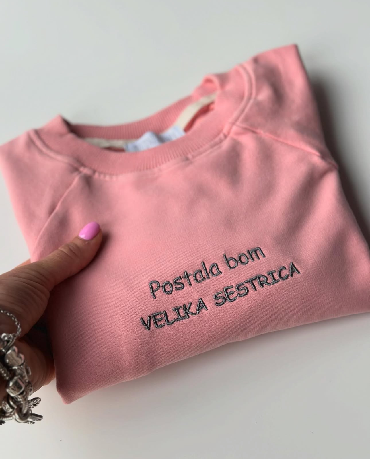 Na jopo izvežemo ime ali pa krajši napis po želji (napišite v okence). Nekaj idej za napis: big sis, lil sis, big bro, lil bro, mommy’s boy, daddy’s girl, trouble maker, pridem 2024, Anin baby shower, baby shower 2024 … ????